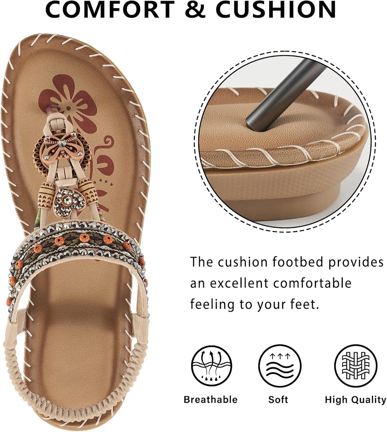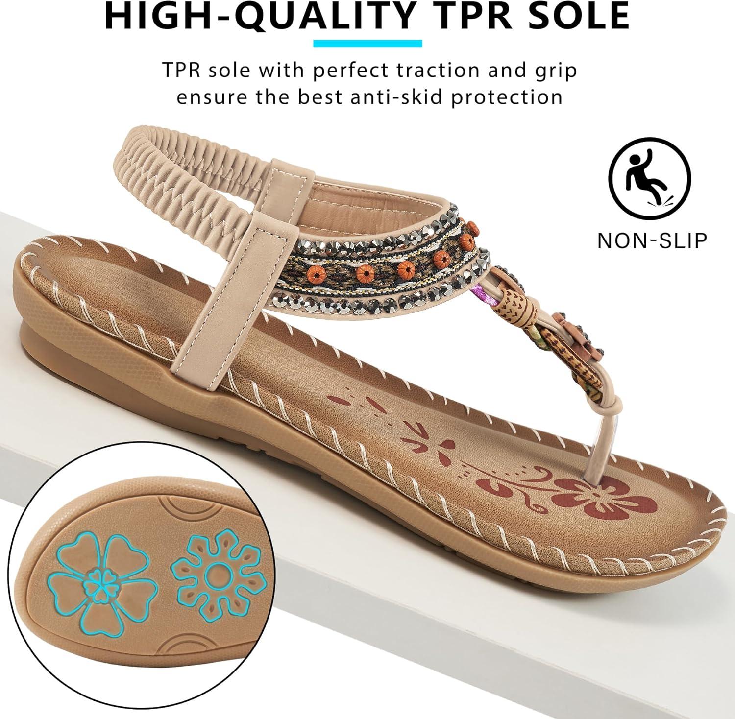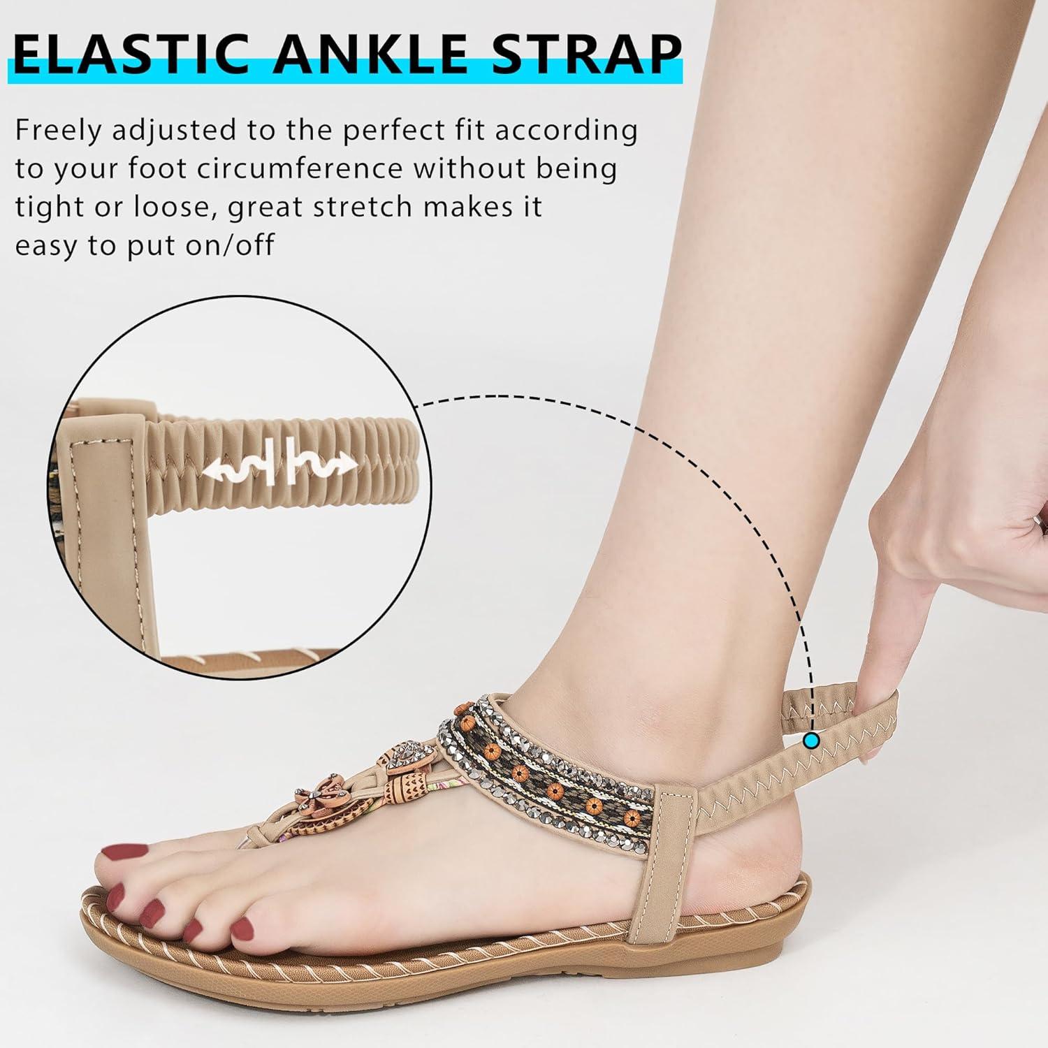Sandals Women Dressy Flats: Bohemian Flat Sandals for Women Comfortable Summer Casual Flip Flops Elastic Ankle Strap(Beige)