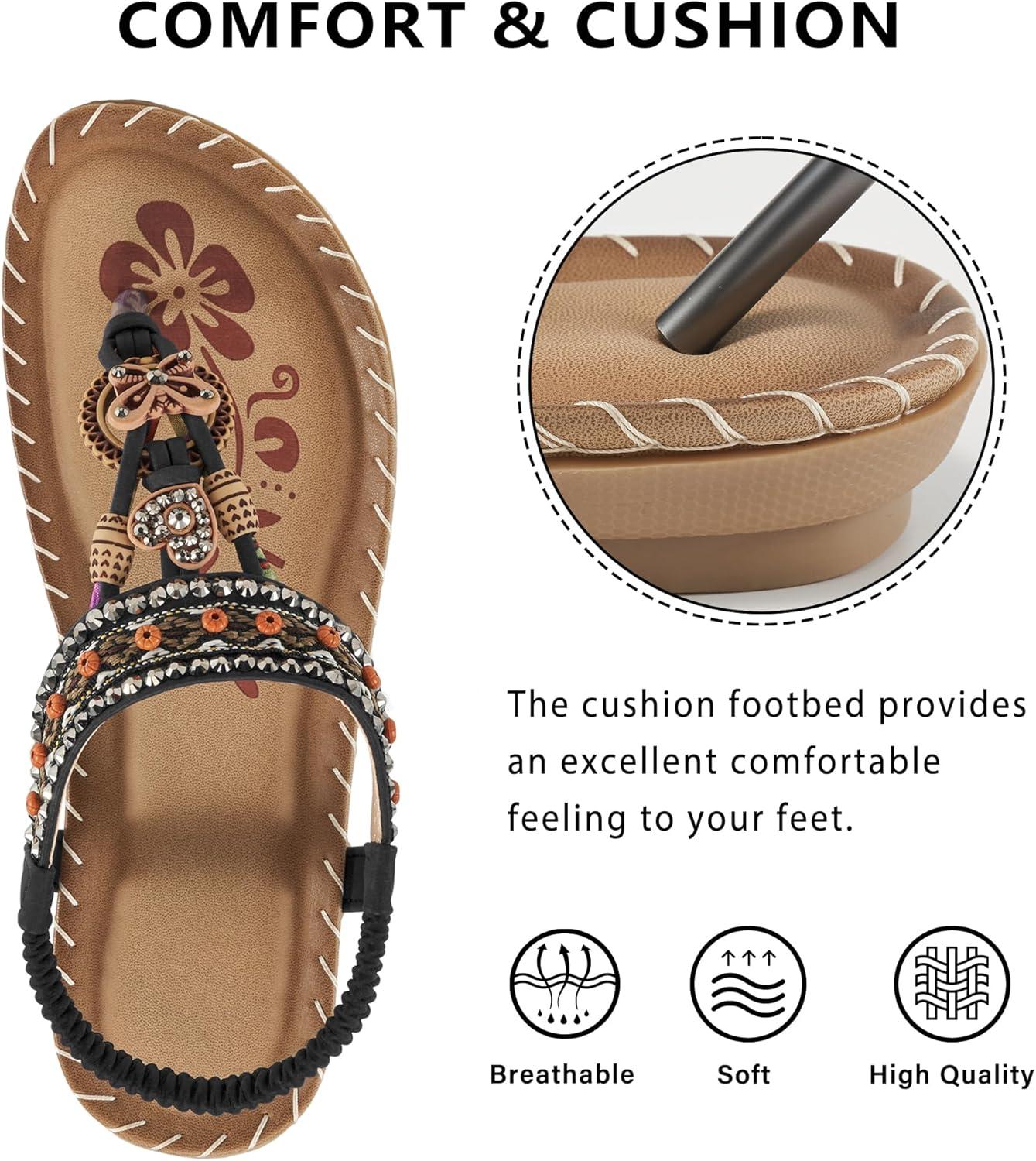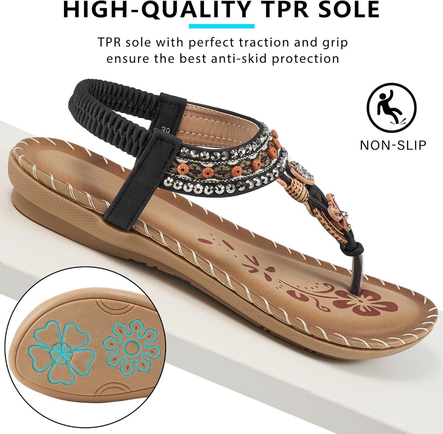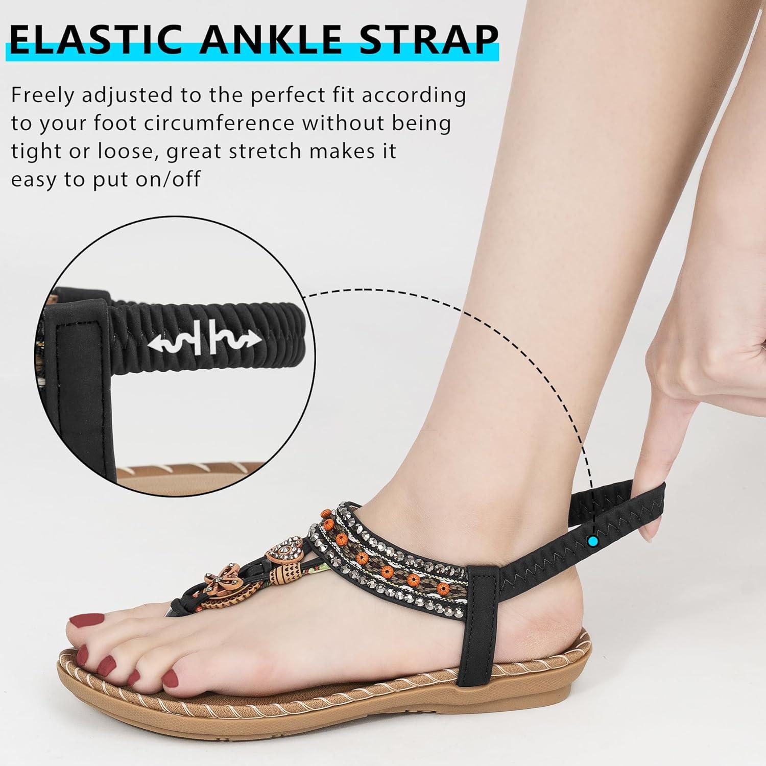 Sandals Women Dressy Flats: Bohemian Flat Sandals for Women Comfortable Summer Casual Flip Flops Elastic Ankle Strap(Black)